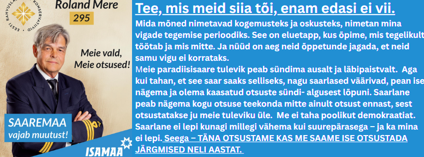 Põlgan valetamist. Põlgan vastutuse hajutamist ja selle vältimist. Ma ei saa olla partei nägu, sest mul on oma nägu. Ent see ei tähenda, et ma ei tahaks Saaremaa tulevikku kujundada. Vastupidi. Ma tahan näha, et siin ei mõõdetaks edu pelgalt rahakotis, vaid ka tarkuses, vaimsuses ja julguses mõelda kaugemale kui järgmine eelarverida.