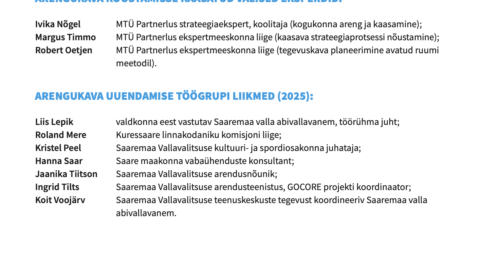 Artikli lugejal võib kergesti tekkida mulje, et kirjeldatud plaanid on kooskõlas Saaremaa valla kogukondliku tegevuse arengukava 2021–2030 sisuga või isegi selle loogiline jätk. Tegelikkuses on olukord teine. Kuigi sama abivallavanem osales 2025. aasta kevadel arengukava uuendamise töörühmas, ei olnud tema selle dokumendi algataja ega sisuline vedaja, küll aga vallavalitsuse poolne aktiivne osaleja. Kogu protsessi tegelik eestvedaja oli Kristiina Maripuu, kelle juhtimisel toimusid nii kogukondade ümarlauad kui piirkondlikud arutelud. Mina ise osalesin samuti selles protsessis Kuressaare linnakodaniku komisjoni esindajana ning võin kinnitada, et just teenuskeskuste juhid ise olid need, kes tõid lauale vajaduse määratleda oma roll kogukondlikus juhtimises senisest selgemalt ja sisukamalt.